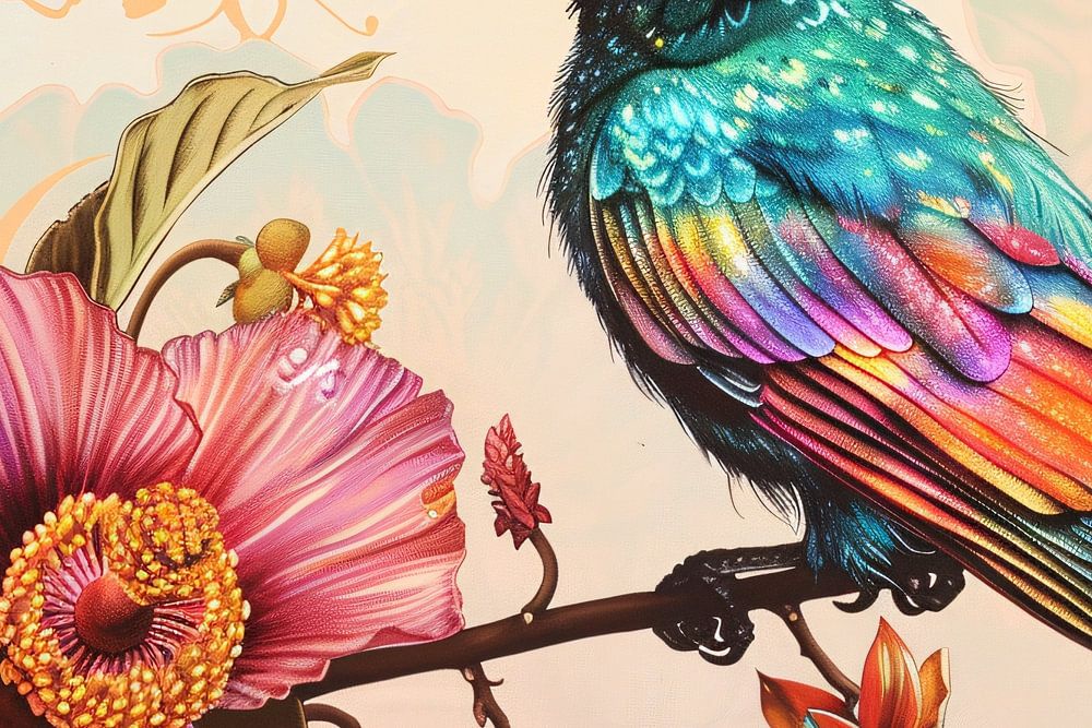Diese wunderschöne Illustration zeigt einen farbenfrohen tropischen Vogel, der sich elegant auf einem Ast ausruht, umgeben von leuchtenden Blumen. Die detaillierte Darstellung der Federn und Blumen strahlt eine einzigartige Kombination aus natürlicher Schönheit und künstlerischem Flair aus. Dieses Kunstwerk bringt Freude und exotische Pracht in jeden Raum. Es ist ideal für alle, die ihr Zuhause mit einem Hauch von Natur und Kunst verschönern möchten. Dieses Design passt perfekt in ein modernes Wohnzimmer, Schlafzimmer oder Esszimmer. Die kräftigen Farben und zarten Details machen es zu einem echten Blickfang, der sowohl elegant als auch dynamisch wirkt.