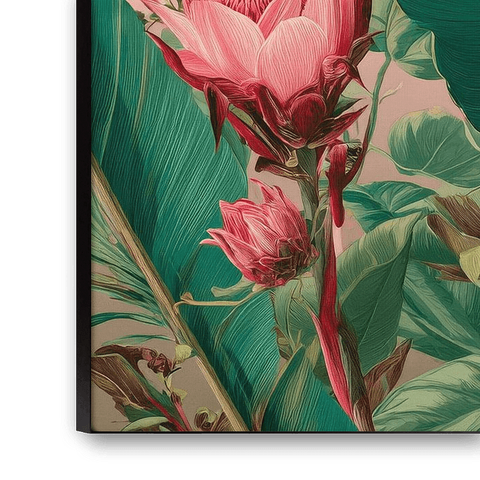Diese lebhafte botanische Illustration zeigt eine üppige Szene mit tropischen Blumen wie Lotusblumen, Paradiesvogelblumen, Ingwerblumen und Protea's, eingerahmt von üppigen Bananenblättern vor einem sanften rosa Hintergrund. Schmetterlinge und tropische Vögel verleihen der Komposition einen verspielten und lebendigen Touch. Die satten Farben, die kunstvollen Details und die exotische Atmosphäre machen dieses Kunstwerk zu einem Blickfang in einem botanischen, tropischen oder eklektischen Interieur.