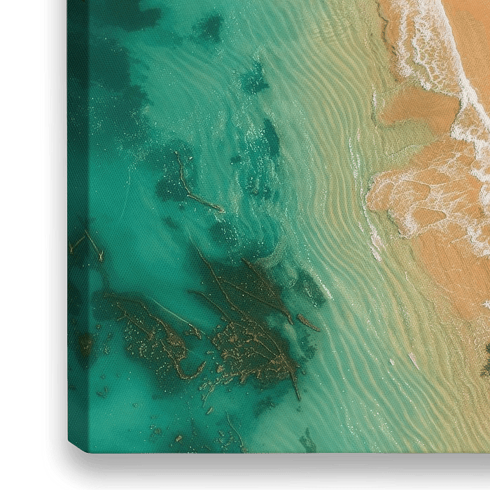 Dieses faszinierende Bild zeigt einen tropischen Strand aus der Vogelperspektive, mit üppigen Palmen, türkisfarbenem Wasser und goldenen Sand. Die Perspektive und die natürlichen Farben schaffen eine beruhigende und friedliche Atmosphäre, ideal für Liebhaber von tropischen Landschaften und Naturmotiven. Perfekt für Wohn- und…