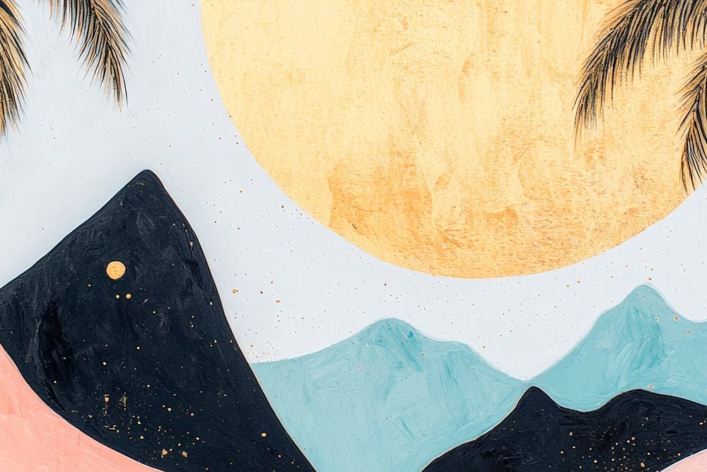 Tropische Träume entfalten sich unter einem strahlenden, goldenen Sonnenuntergang. Zwei elegante Palmen ragen seitlich hervor, während sanfte Hügel in sanften Pastellfarben harmonisch verschmelzen. Dieses Kunstwerk bringt ein Gefühl von Entspannung und Exotik in jedes Wohnzimmer und läd dazu ein, dem Alltag zu entfliehen und die Seele baumeln zu lassen.