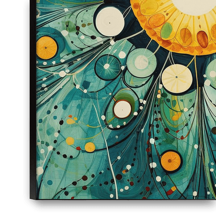 Türkis Mandala | Mandala Kunstwerk - Das Gemälde zeigt ein fesselndes Mandala mit einem sonnigen gelben Herzen, umgeben von kreisförmigen Mustern, die an Wellen und organische Strukturen erinnern. Der türkisfarbene und blaue Hintergrund verleiht Ruhe und Tiefe, und Sprenkel in Orange, Gelb und Weiß sorgen für einen verspielten…