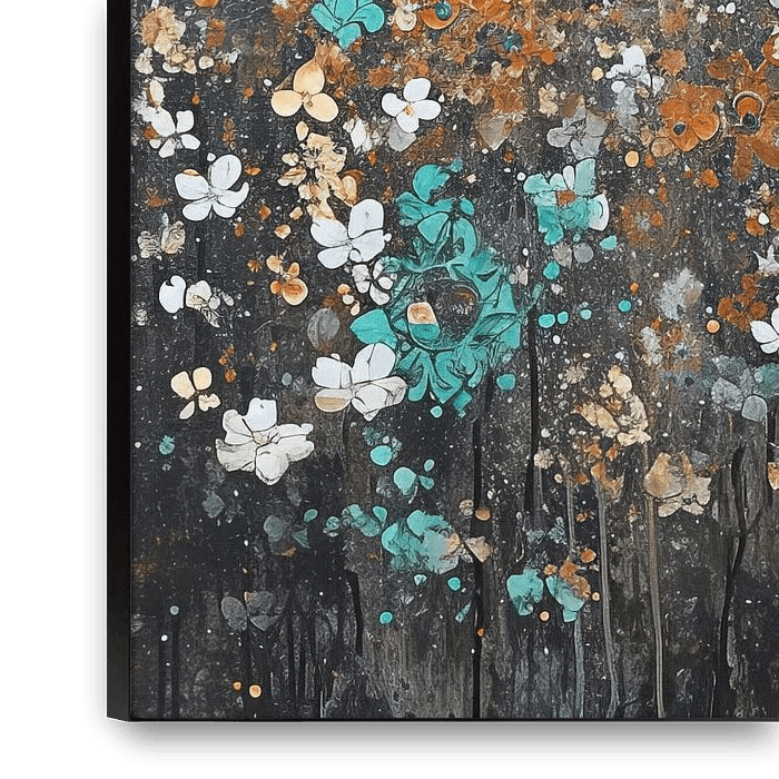Turquoise Bloom - Diese Leinwand zeigt eine faszinierende abstrakte Interpretation eines Blumenfeldes, in dem erdige und warme Gold-, Orange- und Brauntöne mit kühlen türkisen Akzenten vor einem strukturierten Hintergrund funkeln, der an eine verwitterte Wand erinnert. Das Gleichgewicht zwischen Details und verblassten Formen verleiht…