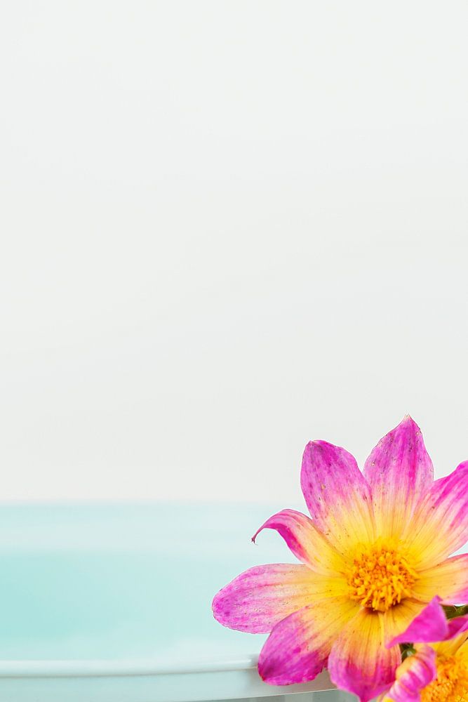Stilleben einer türkisfarbenen Schale mit Blumen in Gelb und Fuchsienrosa, vor weißem Hintergrund