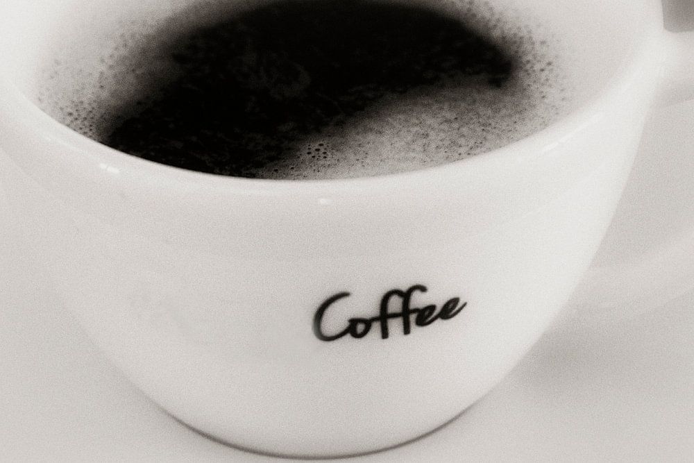 Weiße Tasche mit Aufschrift Coffee und gefüllt mit Kaffee
