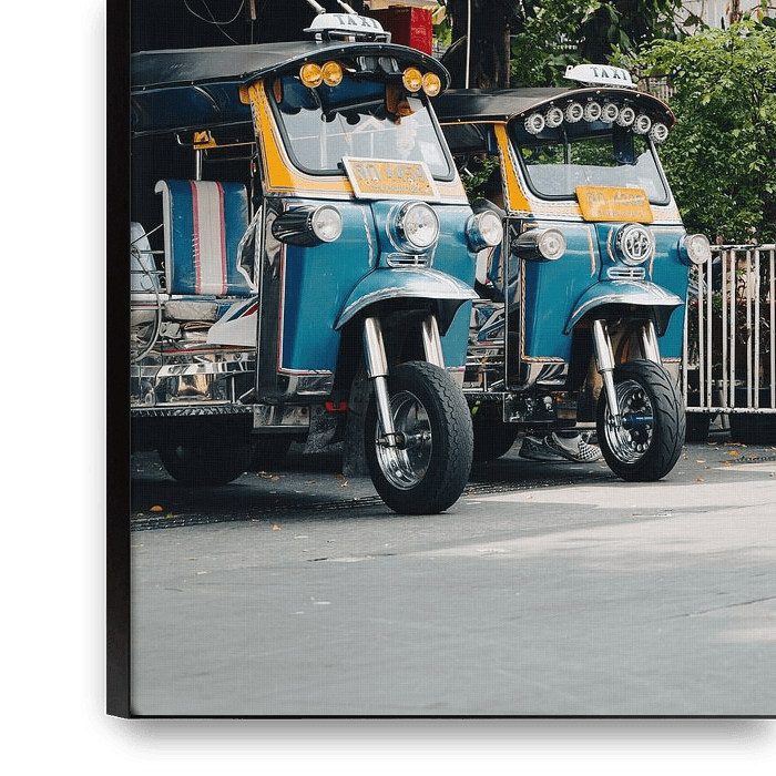 Dieses Foto zeigt ein Tuk Tuk, das in einer ruhigen Straße in Bangkok, Thailand, geparkt ist. Die leuchtenden Farben des Tuk Tuk heben sich von der ruhigen Umgebung der Straße ab. Das Bild strahlt ein Gefühl von Frieden und Ruhe aus und fängt gleichzeitig die typische Atmosphäre Bangkoks ein.