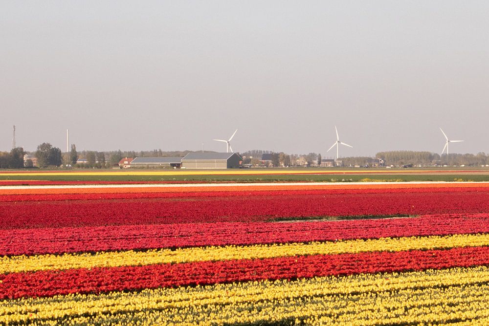 Dies ist ein Bild von Tulpenfeldern mit Windmühlen im Hintergrund. Ein wirklich typisch holländisches Bild.