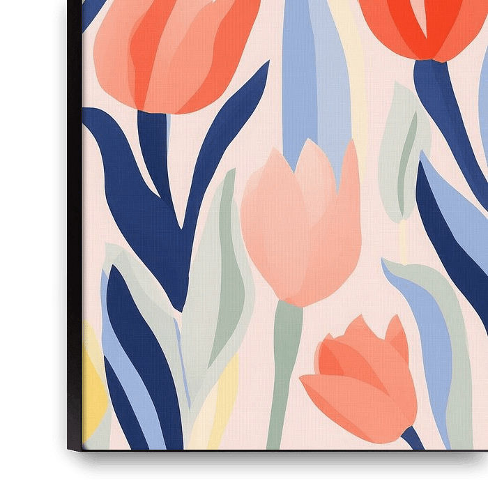 Das Bild zeigt ein Muster aus stilisierten Tulpen in verschiedenen pastelligen Farben, darunter Rot, Gelb, Rosa und Blau. Die Tulpen sind in einem abstrakten, flächigen Stil dargestellt, wobei die Blütenblätter und Blätter in weichen, geschwungenen Formen und Pastelltönen gehalten sind. Der Hintergrund ist hell und lässt die Farben der…