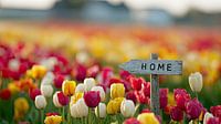 Dieser Fotodruck bringt den Frühling an die Wände des Wohnraums – mit einem Tulpenfeld in den Farben Rot, Gelb und Weiß. Im Mittelpunkt der Komposition steht ein hölzerner Wegweiser mit der Aufschrift „HOME“, der einen Akzent zwischen den Blumen setzt.
