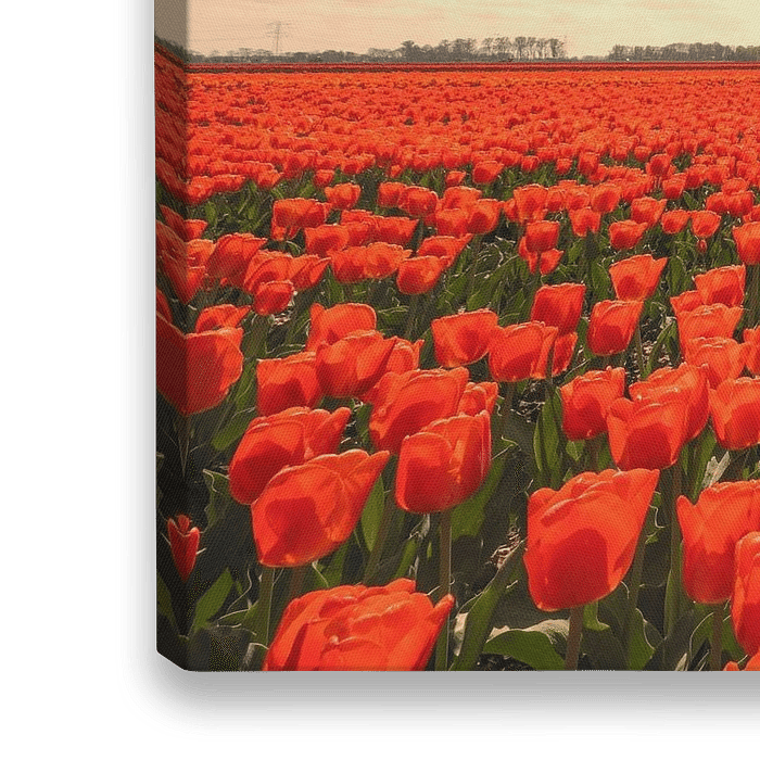 Rote Tulpen, die im Frühling auf landwirtschaftlichen Feldern im Noordoospolder in Flevoland, Niederlande, wachsen. Der Noordoostpolder ist ein Polder in der ehemaligen Zuiderzee, der ursprünglich angelegt wurde, um mehr Land für die Landwirtschaft zu schaffen.