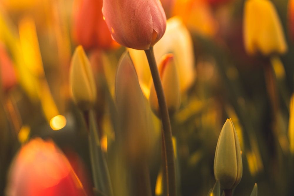 Ein Feld mit Tulpen in Nordhessen bei Sonnenuntergang im Frühling, Nahaufnahme mit unscharfem Hintergrund
