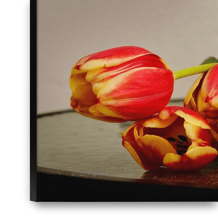 Bestelle dieses Blumen-Wandbild Tulpen und Rosen von Laura von S als Reproduktion auf Leinwand, Alu-Dibond, als Poster, Fototapete oder Acrylglasbild.