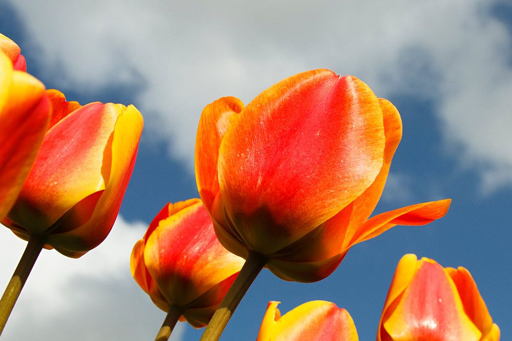 Mooie rood gele tulpen met een blauwe wolkenlucht.
