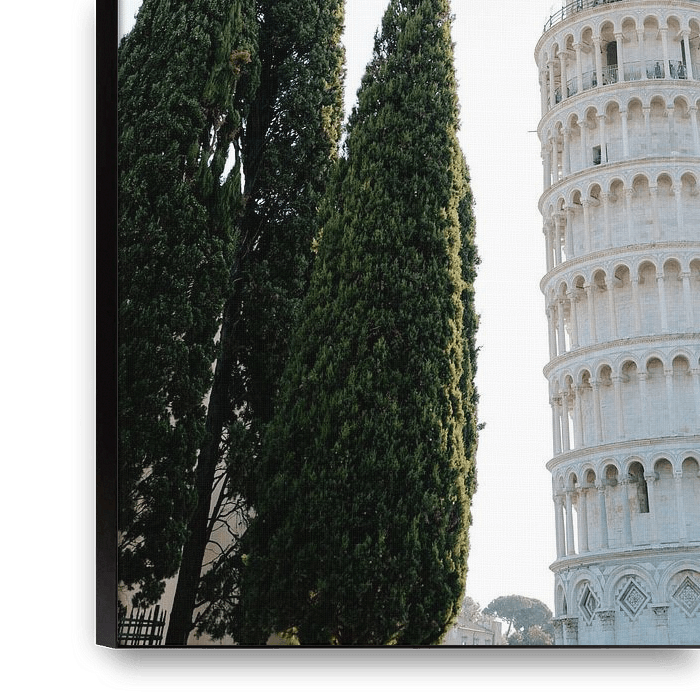 Durch das gerade Dach kann man gut erkennen, wie schräg der Turm ist. Die Bäume geben einen Eindruck von der Größe des Turms. Die Farben sind sanft und sommerlich.