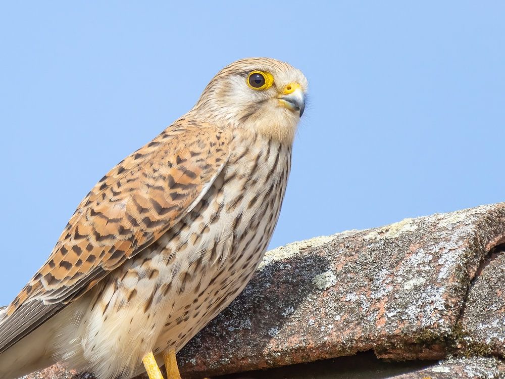 Ein hübsches Turmfalkenweibchen auf einem Dach