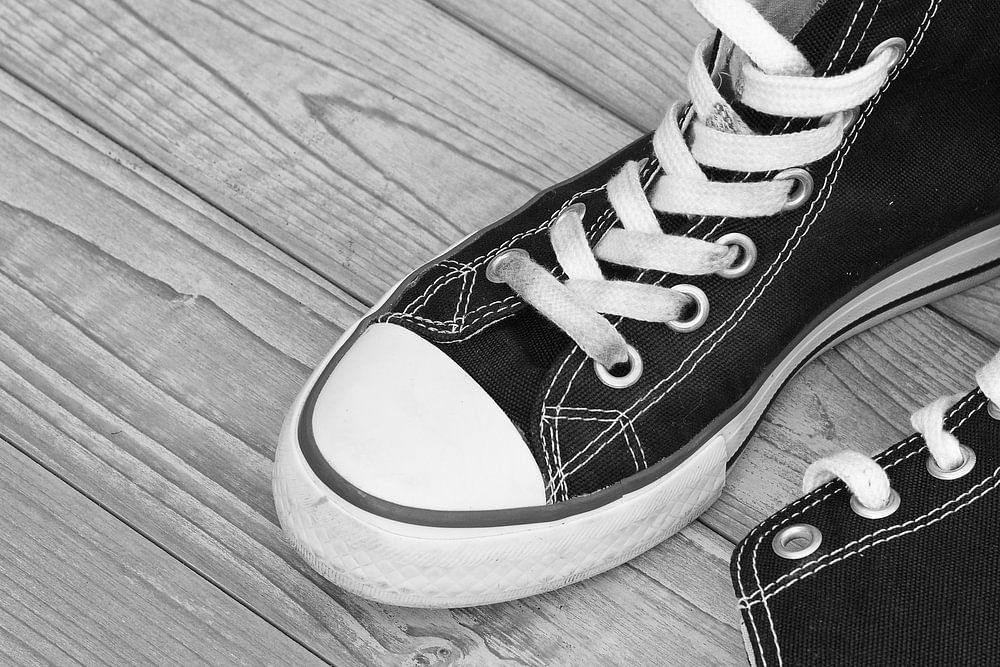 Detail von Sneaker-Schuhen aus Retro-Leinwand auf Vintage-Holz-Hintergrund. Grunge-Teenager-Rock-Stil.
