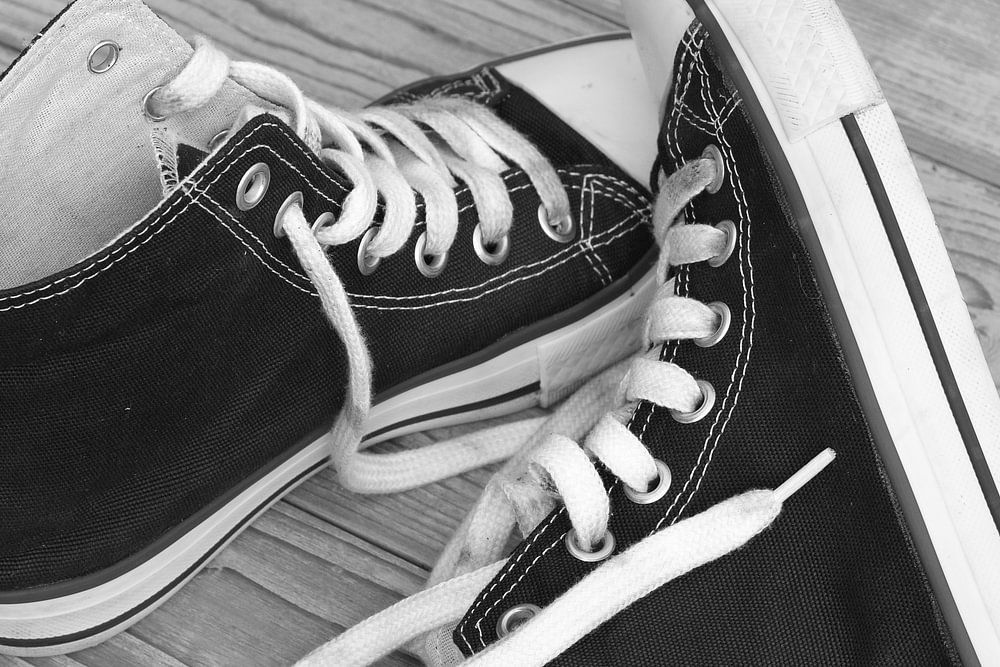 Detail von Sneaker-Schuhen aus Retro-Leinwand auf Vintage-Holz-Hintergrund. Grunge-Teenager-Rock-Stil.