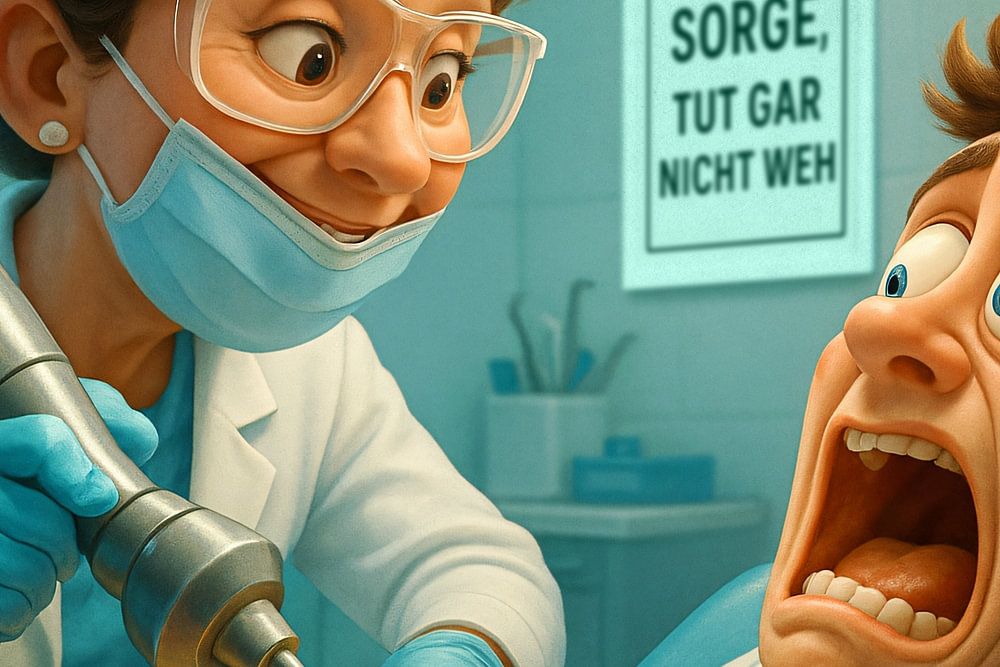In einer kühlen, sterilen Praxisumgebung steht eine Zahnärztin mit ruhigem Lächeln und überdimensionalem Bohrer bereit – ganz die Gelassenheit in Person. Der Patient im Behandlungsstuhl dagegen klammert sich panisch an die Armlehnen, die Augen weit aufgerissen, der Mund geöffnet wie in einem stillen Schrei. Im Hintergrund prangen sterile Instrumente und ein aufmunterndes Poster. Ein plastisch überzeichnetes Bild, das mit Humor genau das einfängt, was viele beim Zahnarzt denken, aber nie aussprechen.