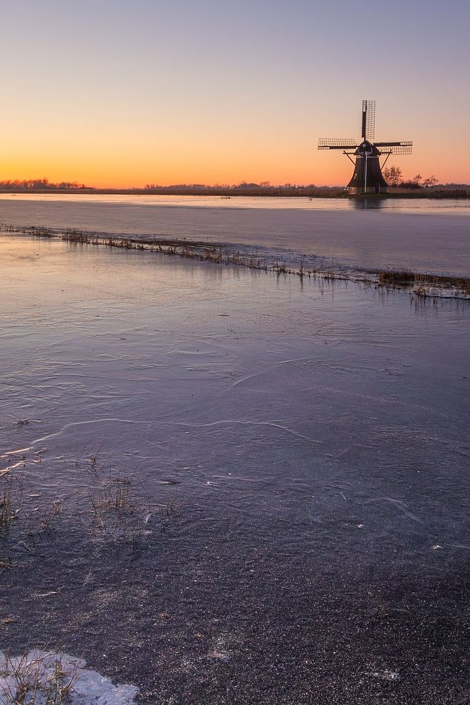 Foto von der schönen Ypey-Mühle auf dem Ryptsjerksterpolder in Fryslan kurz nach Sonnenuntergang. Hier, wenn es friert, kann man oft einer der ersten Orte zu skaten. Das wurde jetzt oft gemacht. Als dieses Foto gemacht wurde, war die Sonne bereits untergegangen und es wurde ruhiger. Der Himmel färbt sich danach immer noch schön. Im Vordergrund kann man etwas Schnee im Gras und auf dem Eis sehen. Ein schönes Winterbild. Obwohl ich dieses Mal nicht selbst Schlittschuh gelaufen bin, habe ich die Geselligkeit damals sehr genossen. Das Foto wurde im Januar 2024 aufgenommen.