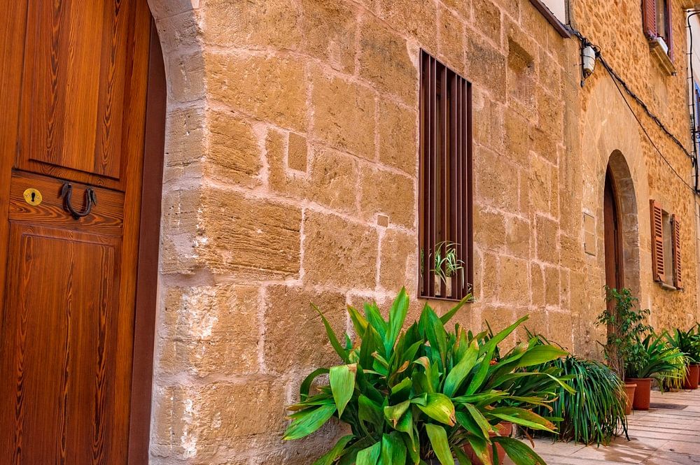 Typische Straße mit Topfpflanzen in der Altstadt von Alcudia, Mallorca, Spanien, Balearische Inseln