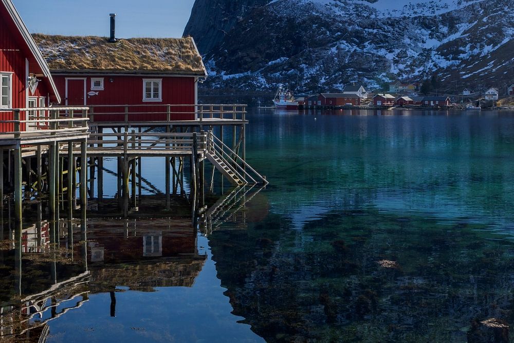 Typische hölzerne Fischerhütten auf Holzpfählen auf den Lofoten in Norwegen mit ihrer Spiegelung im Wasser