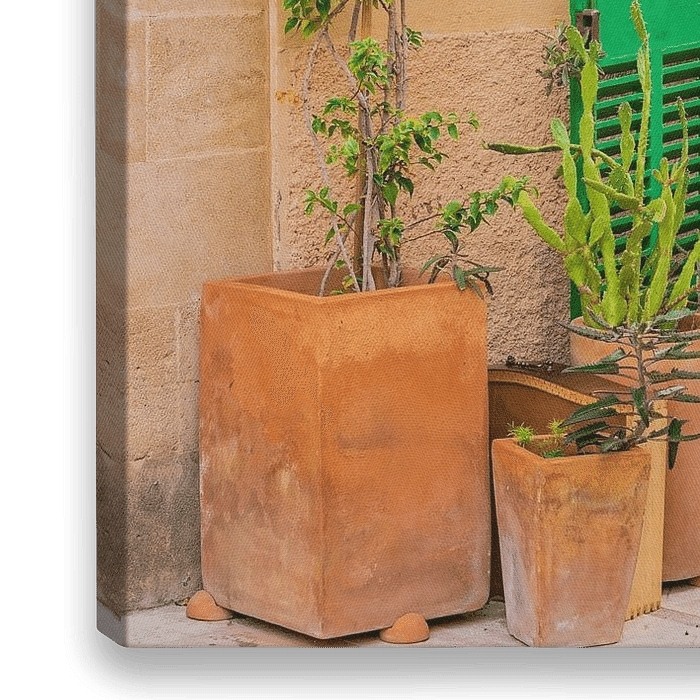 Bestelle dieses Blumen-Wandbild Typisches mediterranes Haus mit Blumenkübeln in der Altstadt von Alcudia, Mallorca Spanien von Alex Winter als Reproduktion auf Leinwand, Alu-Dibond, als Poster, Fototapete oder Acrylglasbild.