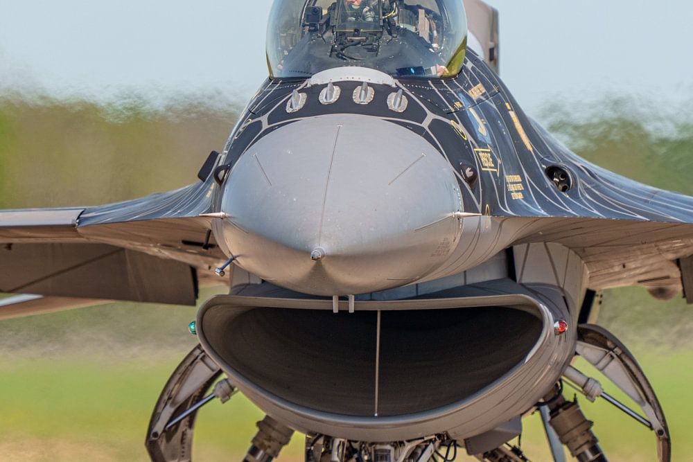 F-16 Viper-Demonstrationsteam der US-Luftwaffe. F-16 des Viper-Demonstrationsteams der US-Luftwaffe auf dem Luftwaffenstützpunkt Shaw. Die F-16 hat ein spezielles Farbschema und wird von einer Pilotin, Captain Aimee "Rebel" Fiedler, geflogen. Dieses Foto wurde am 25. März 2023 auf dem Luftwaffenstützpunkt Barksdale aufgenommen.