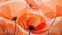Grafische Komposition, die Mohnblumen in Nahaufnahme in einem zeitgenössischen Stil darstellt. Die Mohnblume prägt die Frühlingssaison und überflutet einige Kampagnen mit dieser besonderen roten Farbe. Die Transparenz der Blütenblätter nuanciert diese Farbe und verleiht ihr Leichtigkeit, Anmut und subtile Schönheit.