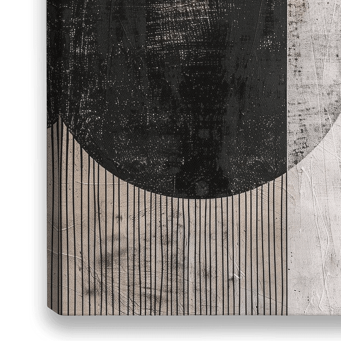 Diese abstrakte Komposition aus sich überlappenden Kreisen in Schwarz, Weiß und Beige strahlt eine moderne, minimalistische Eleganz aus, die sich nahtlos in ein modernes Wohnzimmer oder ein Büro einfügt. Die subtile Textur und die Andeutung von Tiefe durch den geschickten Einsatz von monochromen Schattierungen verleihen diesem Stück…