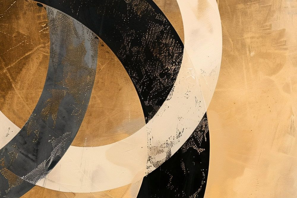 Die Kunst der Einfachheit wird in diesem Stück wunderschön dargestellt. Die minimale Farbpalette aus Sepia-, Gold- und Beigetönen bietet einen ruhigen und doch kraftvollen Look. Die sich überschneidenden Kreise erzeugen einen dynamischen Effekt und ziehen die Aufmerksamkeit auf sich, ohne überwältigend zu wirken, was dieses Design zu einer ausgezeichneten Wahl sowohl für moderne als auch für traditionell eingerichtete Räume macht. Die sanften Texturvariationen verleihen ihm eine subtile Tiefe, die trotz des scheinbar einfachen Designs die Gesamtkomplexität erhöht. Perfekt für eine stilvolle Büroumgebung oder als zentrales Kunstwerk in einem minimalistischen Schlafzimmer. Dieses Kunstwerk lädt zum Nachdenken und zur Kontemplation ein und fügt sich perfekt in die ruhige Atmosphäre eines meditativen Raums ein.