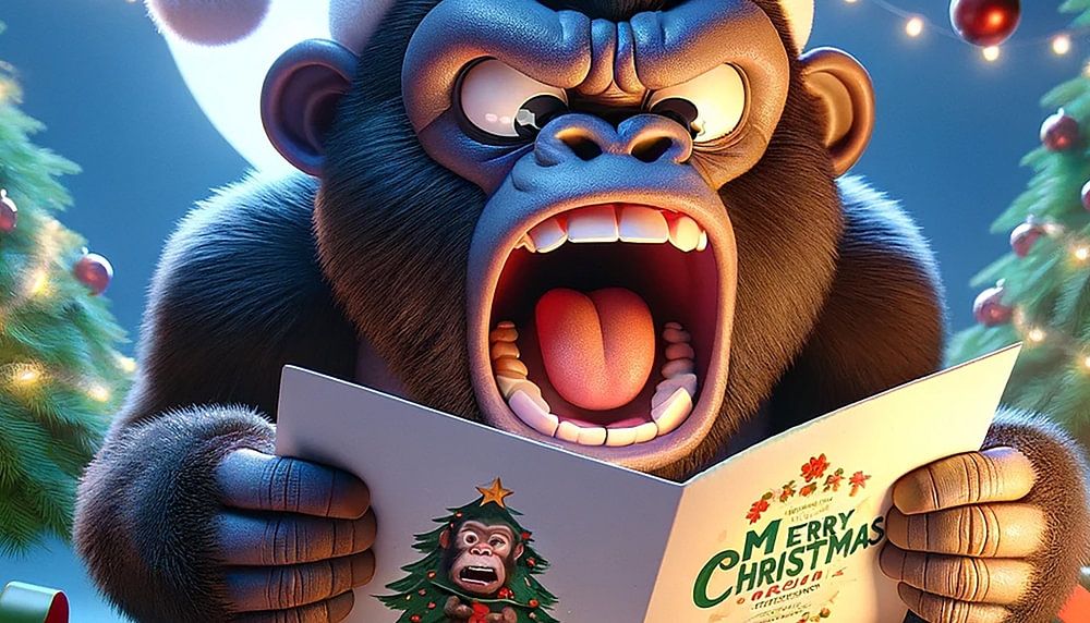 Vor einem festlich geschmückten Weihnachtsbaum hält ein Gorilla eine Weihnachtskarte in seinen Händen, seine Augen und Mund weit aufgerissen in einer Mischung aus Erstaunen und Freude. Der Raum ist reich dekoriert mit Geschenken, Lichterketten und glitzernden Christbaumkugeln, die das warme Licht der Feiertage reflektieren. Die Karte, die er hält, scheint eine unerwartete Nachricht zu enthalten, die den sonst so imposanten Gorilla in kindliche Verwunderung versetzt. Das Bild ist ein Spiel mit dem Kontrast zwischen dem imposanten Wesen des Gorillas und der friedlichen, fröhlichen Weihnachtszeit.