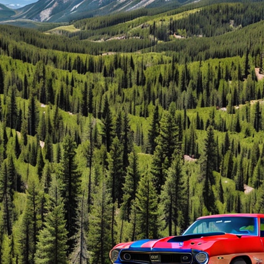 Ein mit Ki generiertes Bild, typisches US Muscle Car in einer Berglandschaft
