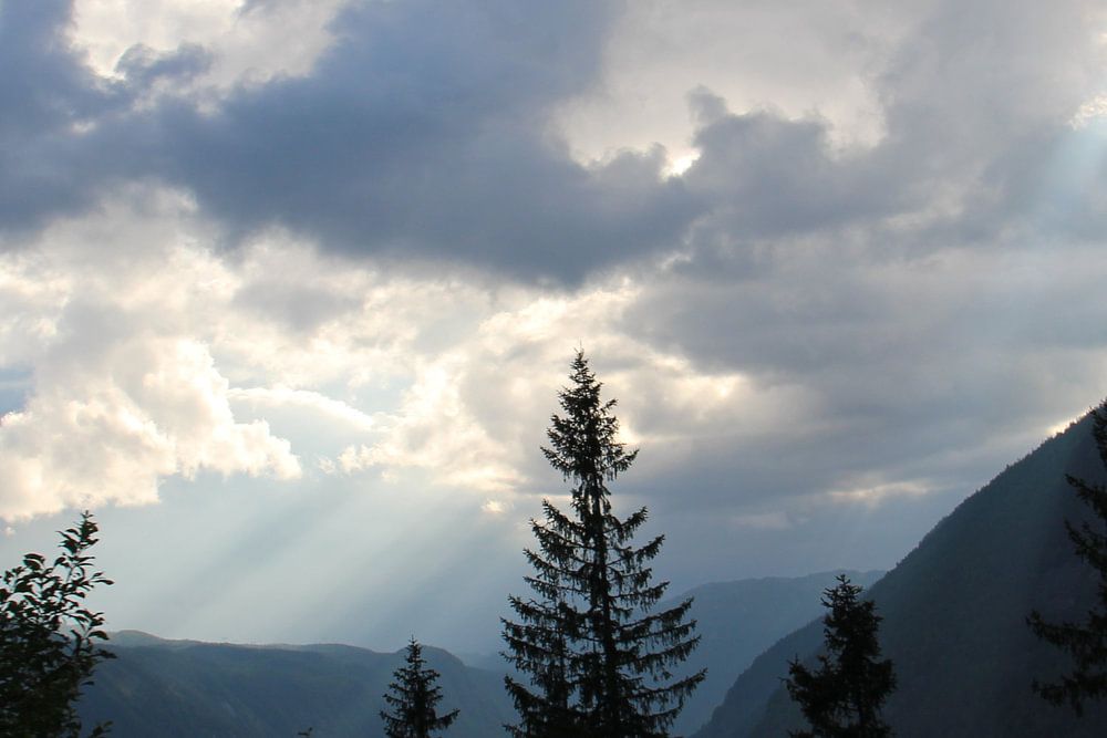 Uitzicht in Noorwegen, een bundel van zonlicht door de wolken heen, met bomen op de voorgrond.