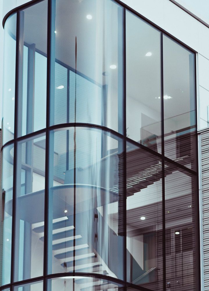 Die Treppe und das runde Glas geben der Ansicht von runden und geraden Linien ein einzigartiges Aussehen.