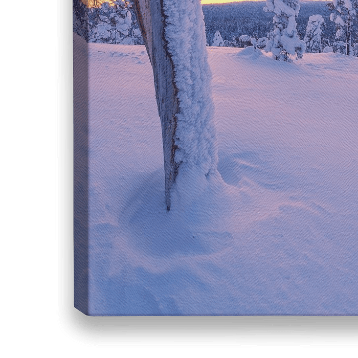 Unberührte Schneelandschaft in pastellfarbenem Licht auf den Hügeln von Luosto, finnisch Lappland