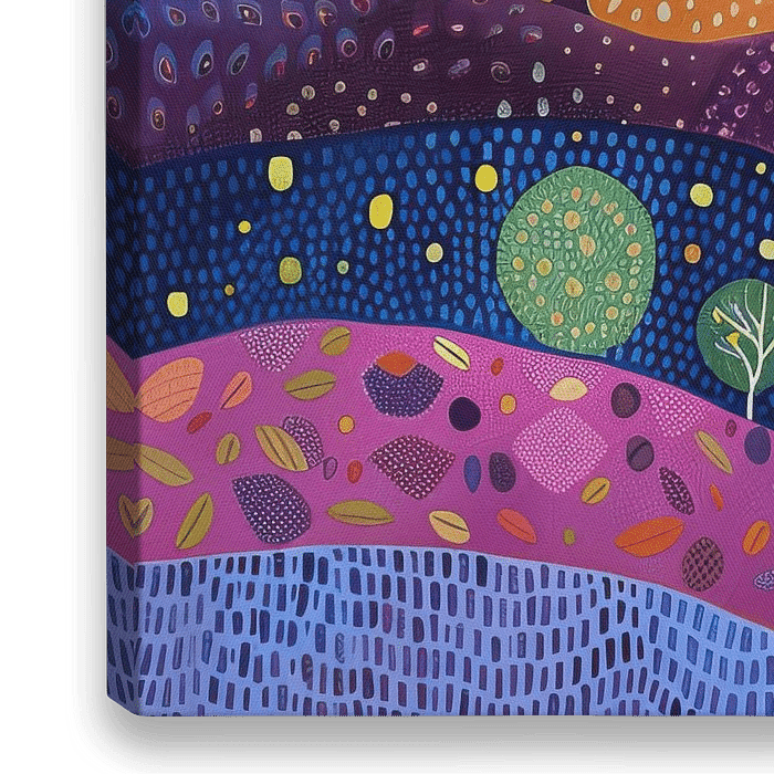 Unendliche Farbharmonie - Dieses Landschaftsgemälde bietet ein lebendiges Mosaik aus farbenfrohen Hügeln und Bäumen, akzentuiert mit detaillierten Mustern und einer Fülle von Texturen, die ein fantasievolles Naturerlebnis darstellen.