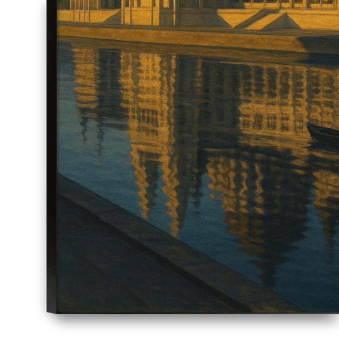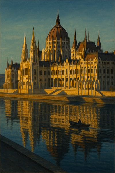 Dieses atemberaubende Kunstwerk zeigt das prächtige ungarische Parlamentsgebäude (Országház) in seiner ganzen neugotischen Pracht, beleuchtet von den intensiven, horizontalen Strahlen der untergehenden Sonne. Die zahllosen Türme, Bögen und die zentrale Kuppel verwandeln sich in einen goldenen Palast, der in leuchtendem Kontrast zum…