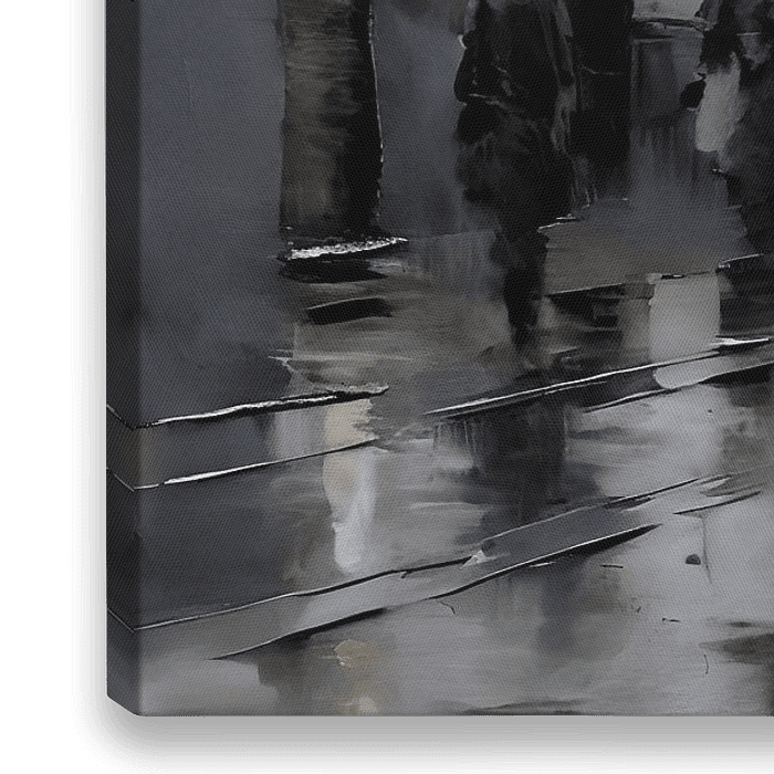 Eine Gruppe farbloser, unförmiger Figuren mit Regenschirmen, die im Regen durch eine triste Einkaufsstraße gehen. Mit künstlicher Intelligenz generiert.