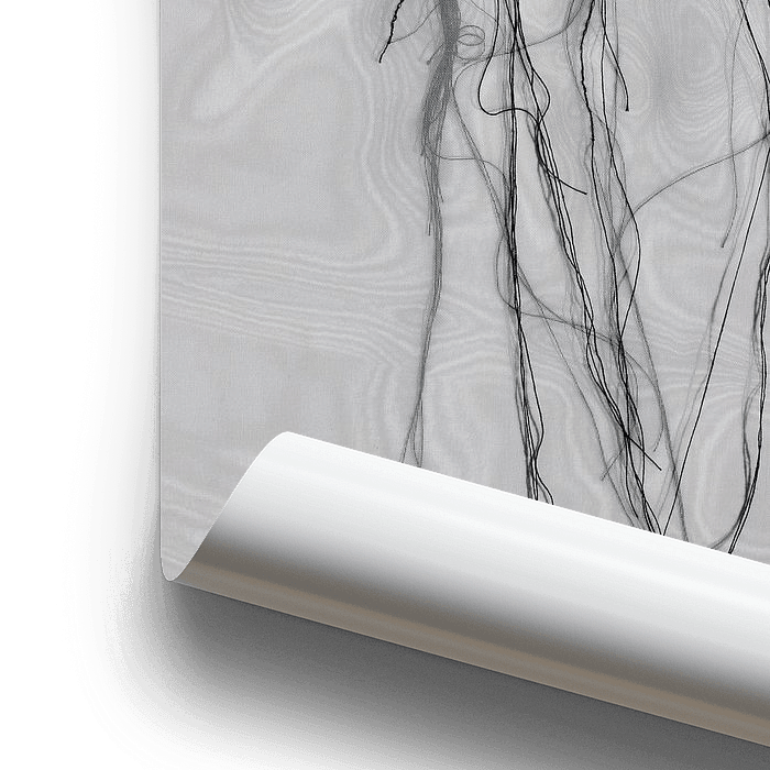 Figurative Arbeit aus schwarzem Garn auf transparentem Textil.