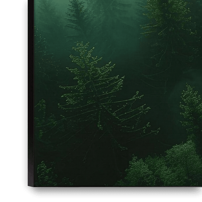 Dieses beruhigende Kunstwerk zeigt ein bezauberndes Bild eines dichten Nadelwaldes, eingefangen in der sanften Umarmung des Morgennebels.