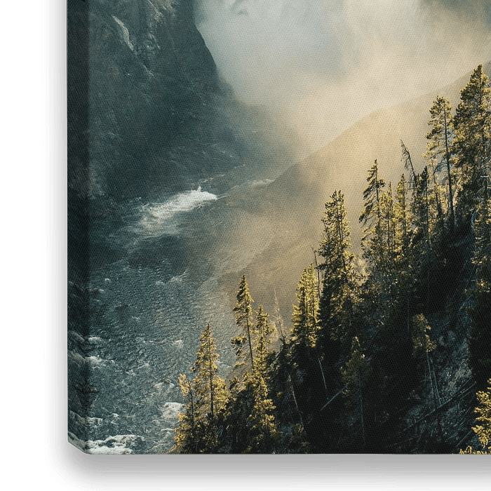 Duotone Reproduktion von Blau und Gelb des Wasserfalls im Yellowstone. Die Wipfel der Bäume werden noch schön von den Sonnenstrahlen beleuchtet.