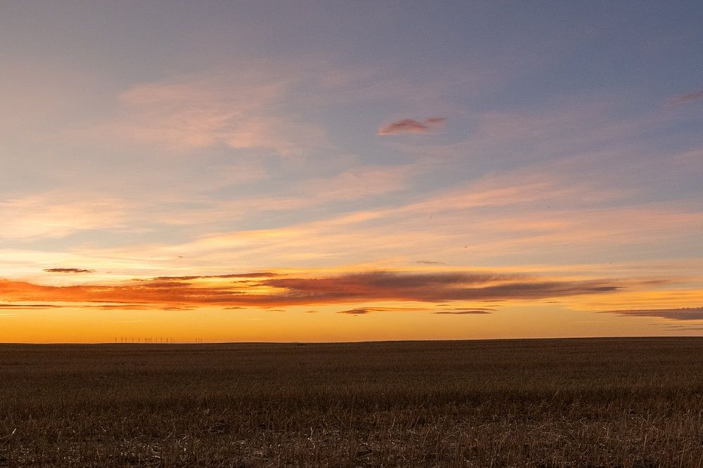 Während meiner kurzen Autofahrt durch die Prärie von Alberta, in der Nähe von Taber, kam ich während eines wunderschönen Sonnenuntergangs an einem wunderschönen Feld mit geerntetem Getreide vorbei. Die Leere der Landschaft und die Stille sind einzigartig zu erleben.