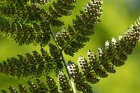 Die Unterseite eines Farnblatts aus der Froschperspektive mit einem hellgrünen, weichen Hintergrund. Alles ist in Grüntönen gehalten, außer den Sporen.