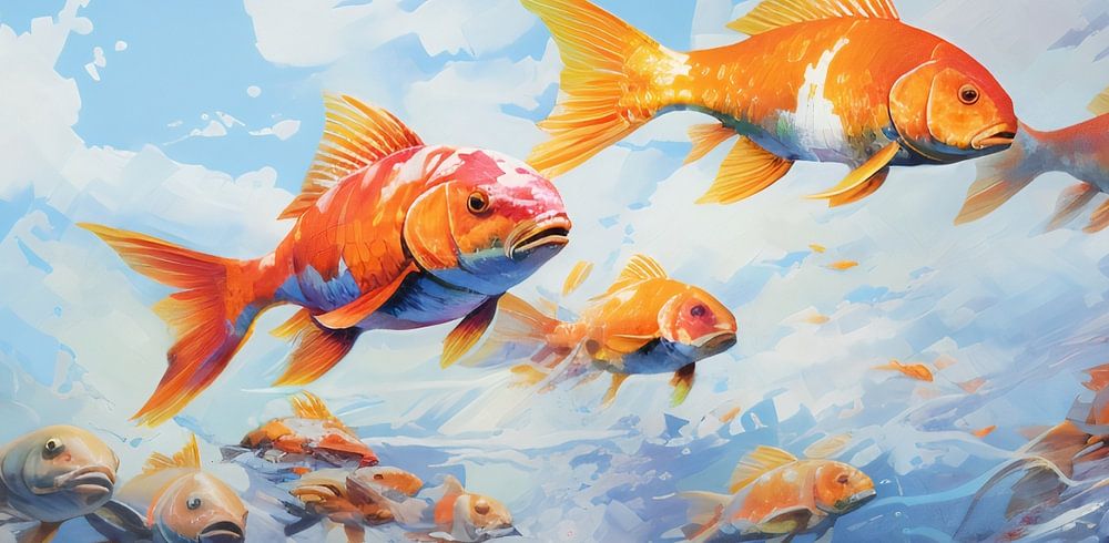 Fantasievolles Bild mit einem Schwarm bunter Fische. Was mich an diesem Bild besonders anspricht, ist die Perspektive, durch die sich die Fische schön vom blauen Himmel abheben.