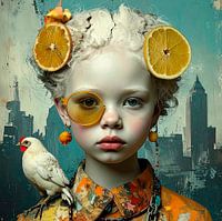 Ein hübsches junges Mädchen mit porzellanweißer Haut und weißem Haar trägt eine halb orange-gelbe Sonnenbrille. In ihrem Haar stecken Orangenscheiben, und auf ihrer Schulter sitzt ein weißes Huhn. Die orangefarbenen Kugeln in ihren Ohrringen sind kleine Früchte, die ebenfalls orange sind, genau wie ihre Kleidung mit dem bunten Muster.…