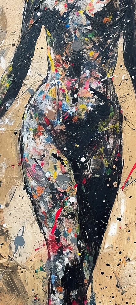 Urban Art Silhouette - Dieses ausdrucksstarke Werk spielt mit dem Kontrast zwischen der stilisierten, monochromen Figur und der spontanen Explosion von bunten Farbspritzern. Ein cleveres Spiel aus Struktur und Chaos, das die urbane Energie von Graffiti mit einem Hauch von Finesse verbindet.