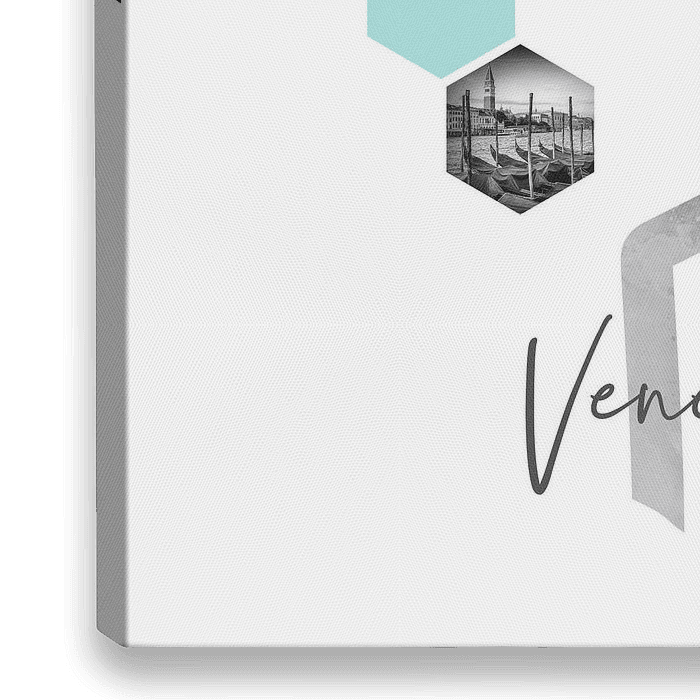 Bekannte monochrome Stadtansichten aus Venedig in geometrischen Formen setzen die einzelnen Momente grandios in Szene. Eine Kombination aus Entdeckungstour, modernen Akzenten, grafischer Rafinesse aber dennoch mit einem Hauch von Minimalismus. Entdecke die folgenden Orte: Rialtobrücke bei Nacht, Blick über den Canal Grande zur Santa…