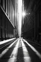 Diese Schwarz-Weiß-Fotografie fängt die Essenz urbaner Landschaften ein, indem sie das Wechselspiel von Licht und Schatten in den engen Straßen der Stadt zeigt. Das Bild zieht den Betrachter in eine Welt, in der Sonnenstrahlen dramatisch durch die Hochhäuser und Brücken brechen und eine magische, fast mystische Atmosphäre schaffen.…