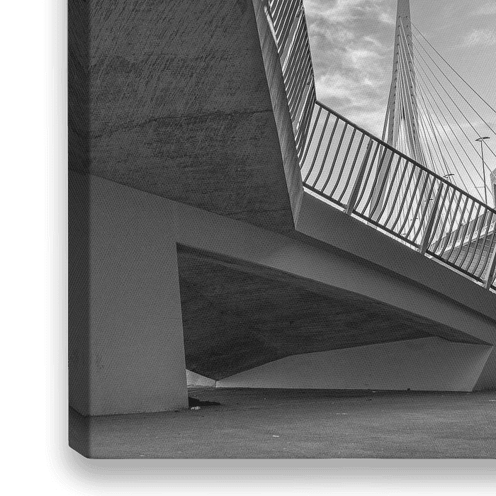 Diese Schwarz-Weiß-Fotografie fängt die architektonische Schönheit der Erasmus-Brücke in Rotterdam auf künstlerische Weise ein. Von einem ungewöhnlich niedrigen Aussichtspunkt aus werden die klaren Linien und geschwungenen Formen der Betonkonstruktion hervorgehoben. Die Schatten des Geländers erzeugen ein rhythmisches Muster, das den…
