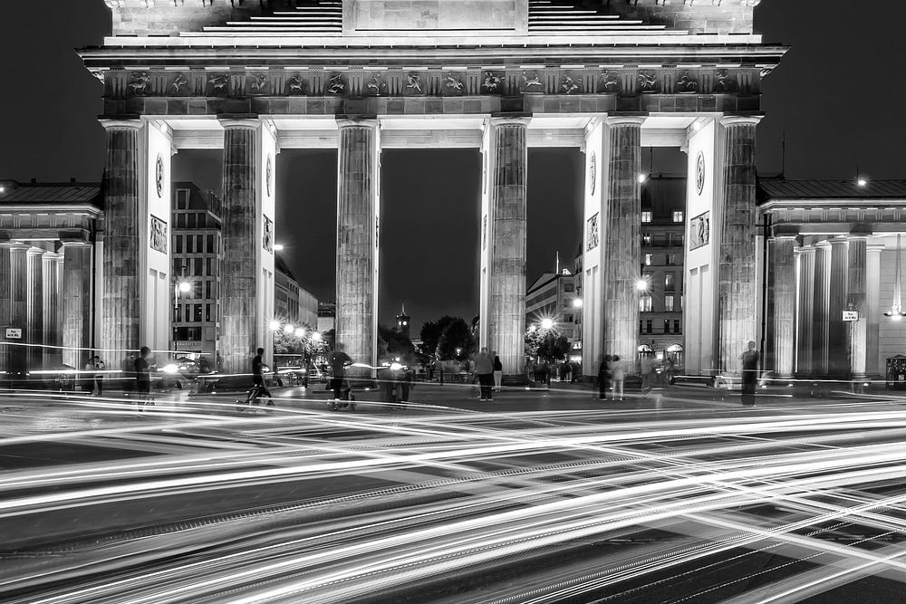 Eindrucksvolle Nachtaufnahme vom Brandenburger Tor in Berlin. Das Besondere an diesem Motiv sind die dynamischen Lichtspuren vorbeifahrender Fahrzeuge, die sich wie fließende Energielinien durch das Bild ziehen und Bewegung sowie urbanes Leben vermitteln. Die perfekte Symmetrie des Bauwerks trifft hier auf moderne Langzeitbelichtung und erzeugt einen spannenden Kontrast zwischen historischer Architektur und zeitgenössischem Fotodesign. Ein echter Blickfang! Eine klassische Schwarz-Weiß-Ansicht, die die architektonische Form mit zeitloser Eleganz hervorhebt.