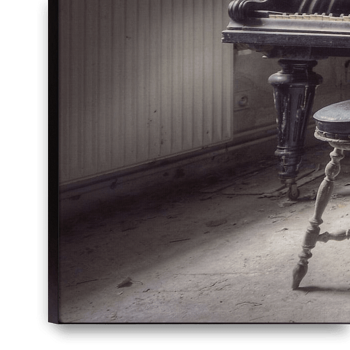 De woonkamer met een oude piano in een verlaten en vervallen huis.